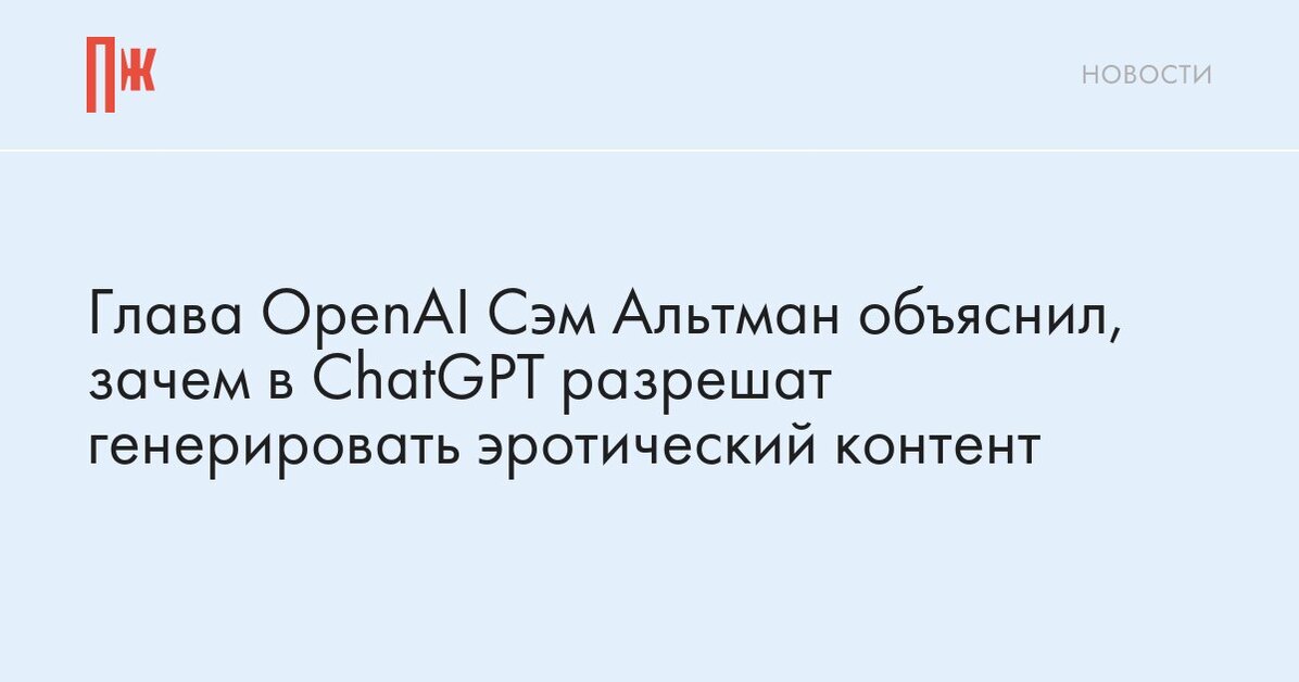 Глава OpenAI Сэм Альтман дал комментарий на своей странице в X после сообщений о предстоящем обновлении ChatGPT — скоро пользователи нейросети смогут создавать эротический контент.