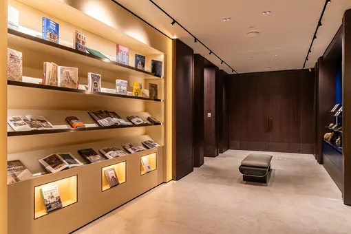 В сердце пространства располагается гостиная с камином для приема гостей. Здесь представлены архитектурные макеты объектов из коллекции MR Private, спроектированные в мельчайших подробностях.