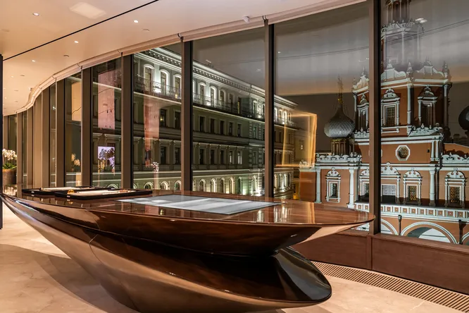 В сердце пространства располагается гостиная с камином для приема гостей. Здесь представлены архитектурные макеты объектов из коллекции MR Private, спроектированные в мельчайших подробностях.
