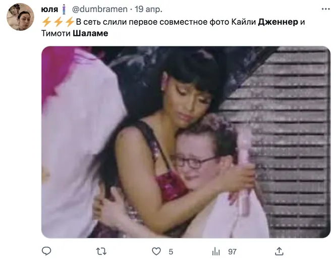В апреле СМИ сообщили, что Тимоти Шаламе и Кайли Дженнер встречаются. Слухи подогрели в том числе снимки папарацци, на которых автомобиль модели припаркован на участке актера. В соцсетях решили, что это самая необычная пара, и отреагировали на статьи таблоидов мемами (их мы показывали здесь).