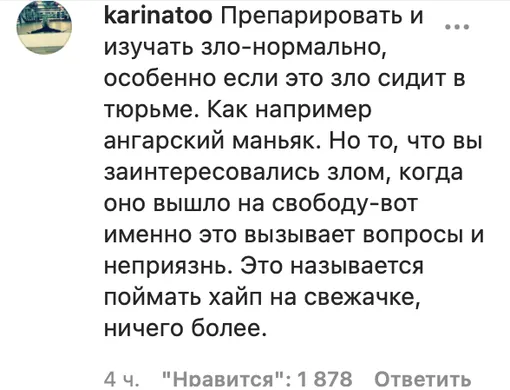 Пользователи в комментариях к публикации раскритиковали выбор фотографии для обложки фильма и сам факт того, что Собчак дала маньяку «кайфовать от собственной значимости» (в интервью Мохов признался журналистке, что ему «по кайфу» повышенное внимание со стороны общественности и СМИ).