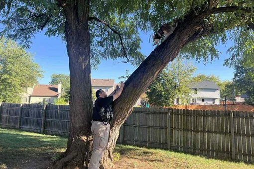 Собака оказалась в «невероятно затруднительном положении» после погони за белкой. Питомец так увлекся игрой, что не заметил, как взобрался наверх по стволу и застрял на ветке на высоте нескольких метров. «Ее обеспокоенные хозяева пытались приманить ее, чтобы она спустилась, но быстро поняли, что без помощи не обойтись. Они позвонили в полицию, а затем получили наш номер», — сообщили представители службы Fort Wayne Animal Care & Control.