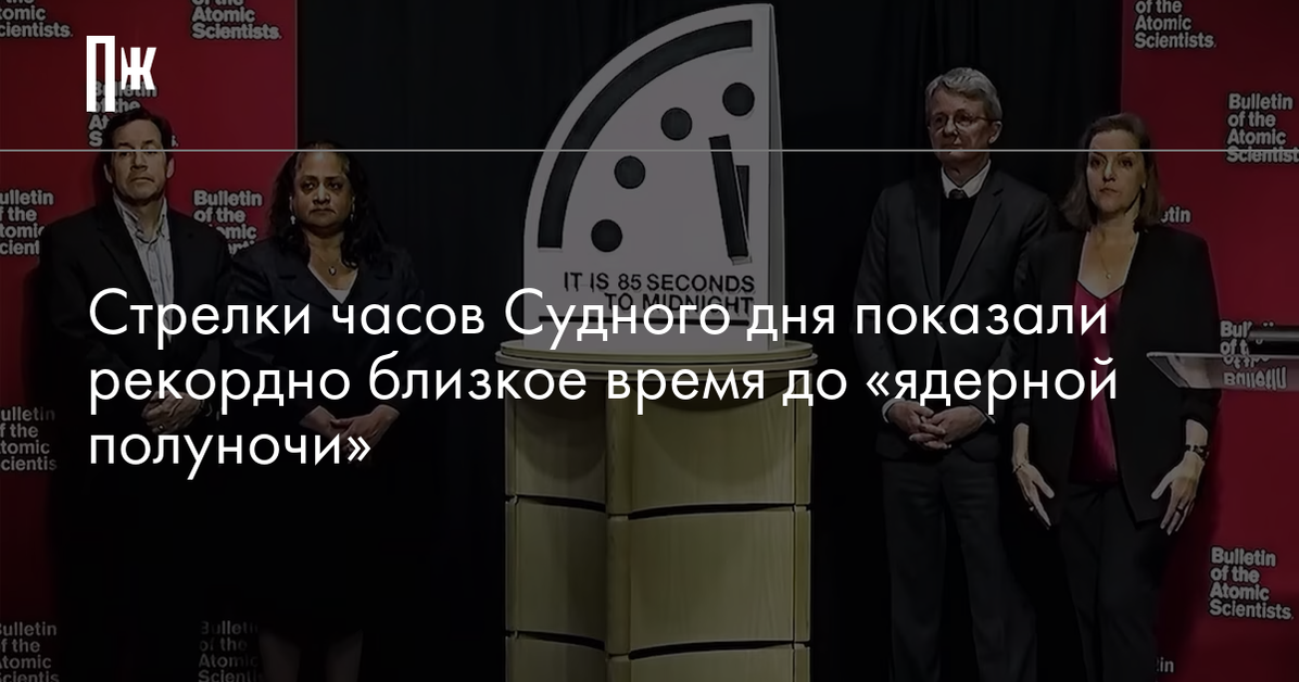 Стрелки часов Судного дня, которые символически обозначают уровень угрозы ядерного взрыва (чем ближе к полуночи, тем ближе конец света) перевели на четыре секунды вперед. Теперь они показывают 85 секунд до полуночи — рекордно близкое время до катастрофы, сообщает CNN.