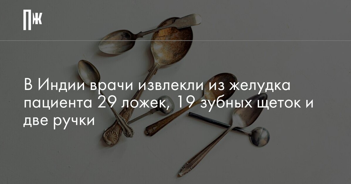 Хирурги частной больнице города Хапур в Индии извлекли 29 стальных ложек, 19 зубных щеток и две острые ручки из желудка 40-летнего пациента. Об этом сообщает The Times of India.