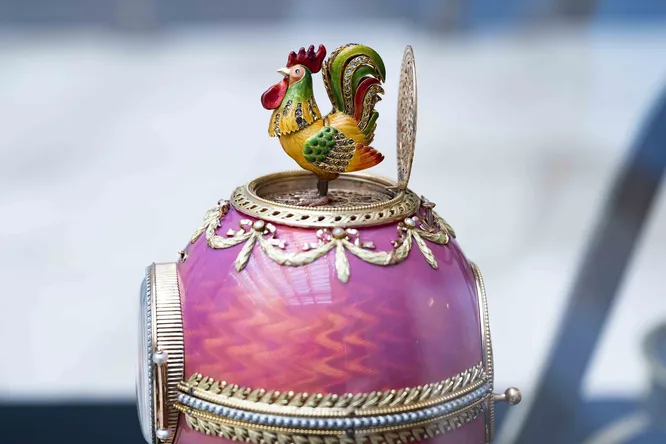 Часы-яйцо Ротшильда были созданы в 1902 году мастером М. Перхиным. Этот сложнейший механизм включает миниатюрного поющего петушка, встроенный часовой орган и розовую прозрачную эмаль. После реставрации часы снова могут издавать звуки птичьего пения: механизм воспроизводит звук на органчике из десяти оловянных трубок и обеспечивает движение птицы, которая перемещается с ветки на ветку, поворачивает голову, открывает клюв и машет хвостиком. Экспонат будет вновь помещен в зал памяти Карла Фаберже в Главном штабе Эрмитажа.