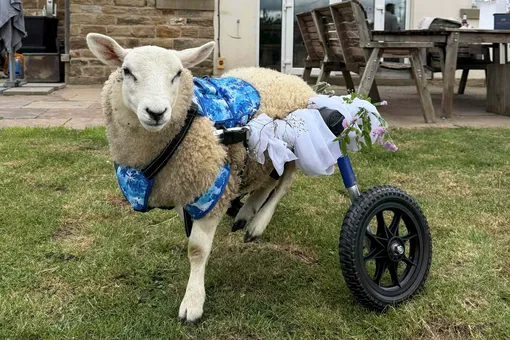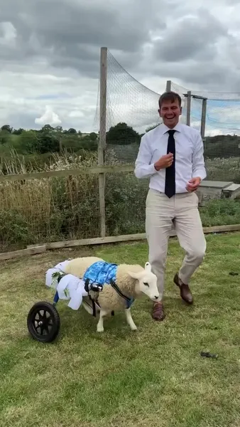 Банни, украшенная цветами и в синей упряжи, прошла вдоль декораций и гостей на специальной инвалидной коляске. По словам Джейка, овца долго репетировала, но он все равно держал под рукой бутылку молока на случай, если она занервничает: «Мы с Банни очень близки. Я знал, что она придет ко мне».