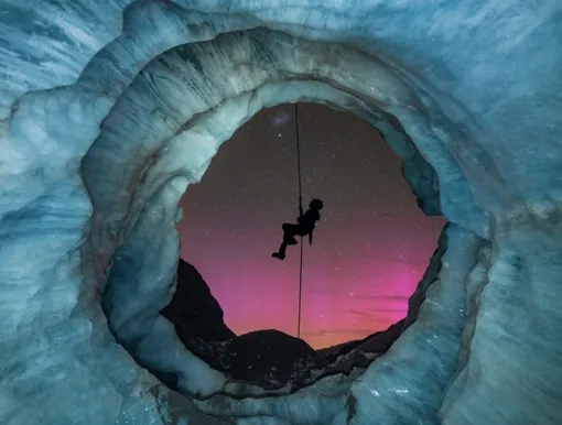 Один из необычных кадров был сделан Тори Харпом, который установил камеру в Национальном парке Аораки в Новой Зеландии. «Ледники — это очень динамичная среда, поэтому я продолжал возвращаться, чтобы следить за изменениями в течение 8-месячного периода. Когда образовалось отверстие пещеры, я представлял себе ночную съемку с моим другом, спускаясь вниз по устью пещеры с удивительным звездным небом Новой Зеландии на заднем плане. Однажды волшебной ночью все, наконец, собралось!», — отметил Харп.