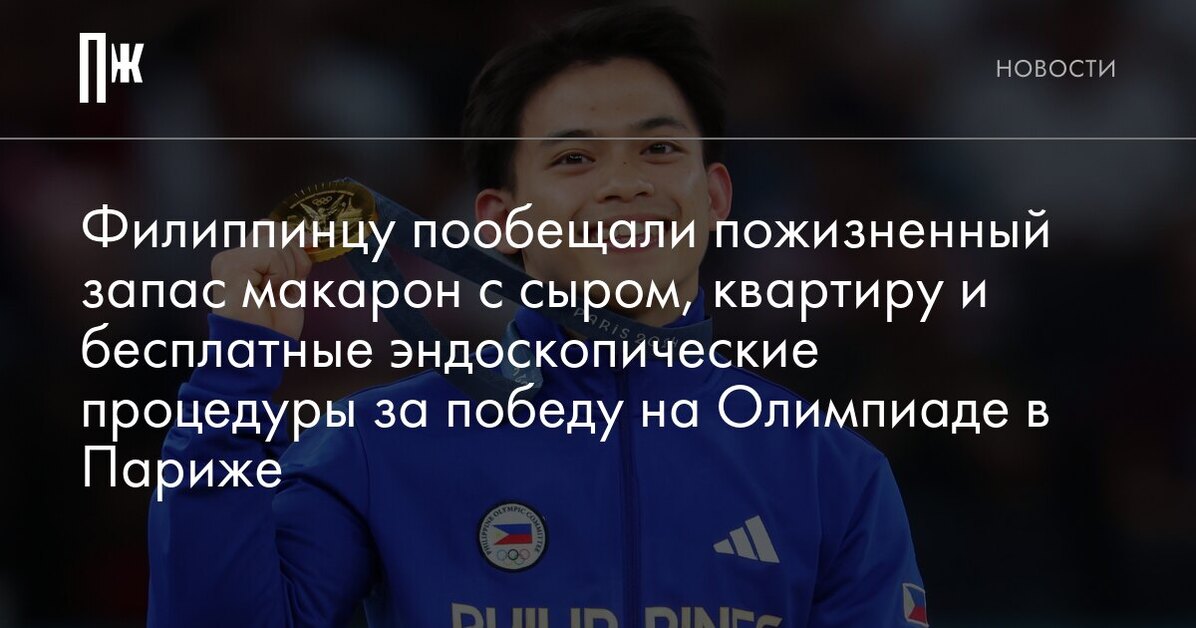 Филиппинцу пообещали пожизненный запас макарон с сыром, квартиру и бесплатные эндоскопические процедуры за победу на Олимпиаде в Париже