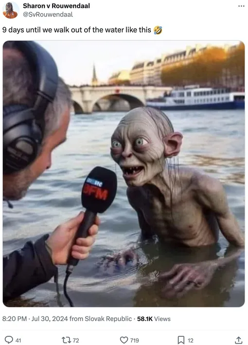 Забавно, что перед заплывом ван Рувендал присоединилась к мемам про качество воды в Сене и пошутила, что после заплыва там спортсмены превратятся Голлума, персонажа франшизы «Властелин колец». «Девять дней до того, как мы выйдем из воды в таком виде», — подписала спортсменка мем, опубликованный 30 июля.