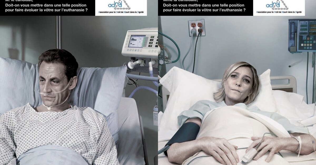 Фотомонтаж Ассоциации «За право умереть с достоинством» (ADMD), призывающий к легализации эвтаназии, c участием Николя Саркози, действующего президента Франции, и Марин Ле Пен, кандидата от Национального фрон