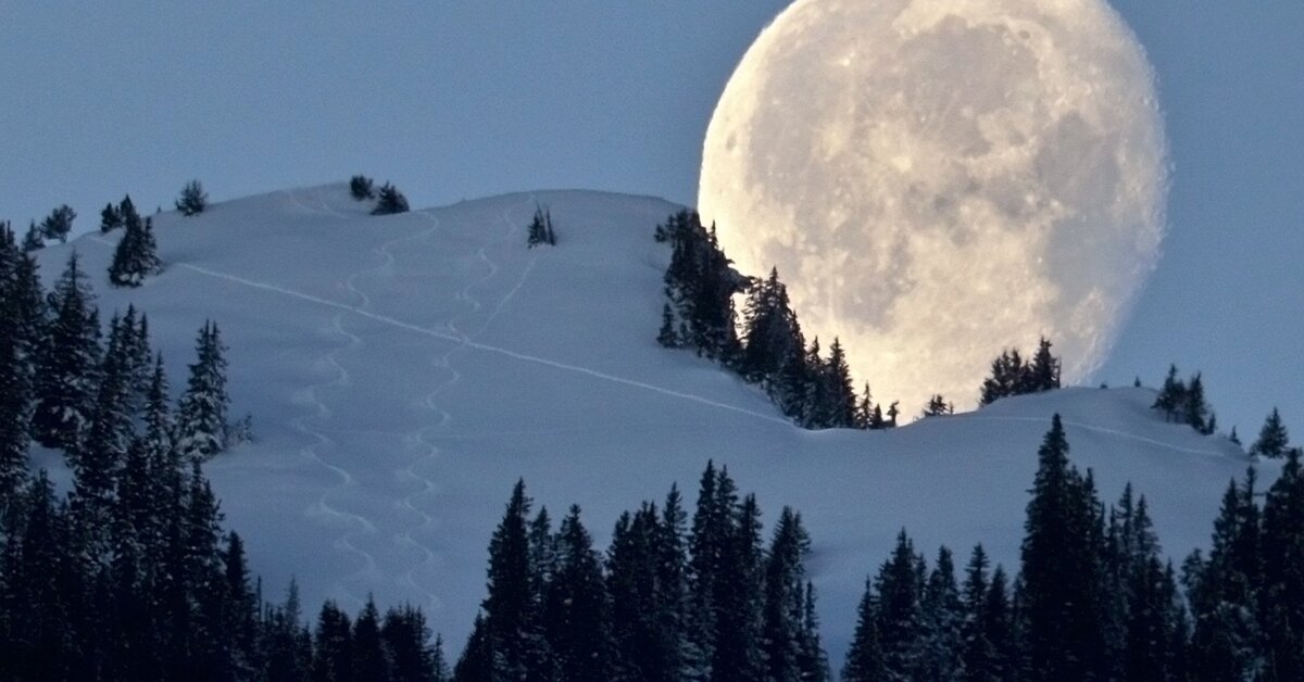 Уходящая луна на фоне горы Цвайершпитце (1858 метров над уровнем моря). Верхняя долина Рейна, Швейцария.