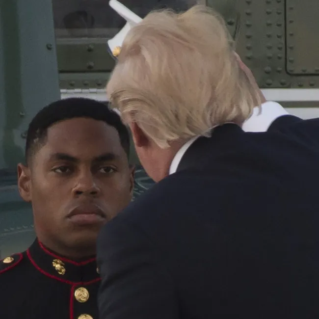 Трамп дважды попытался надеть сорванную ветром фуражку на солдата. Безуспешно