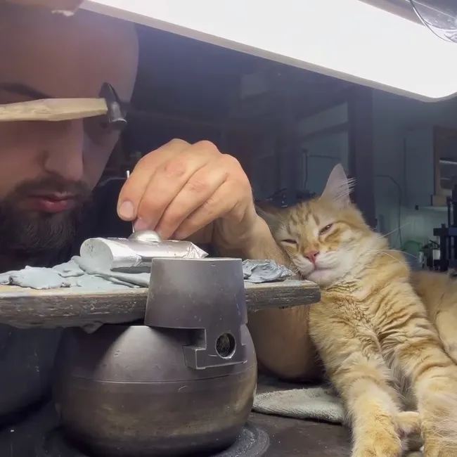 Ювелир-оружейник из Дагестана показывает, как кот помогает ему в ремесле. Рыжик внимательно контролирует процесс либо дремлет на шее мастера