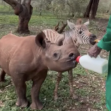 В кенийском питомнике черный носорог неожиданно подружился с зеброй. Их объединила общая трагедия — потеря матерей